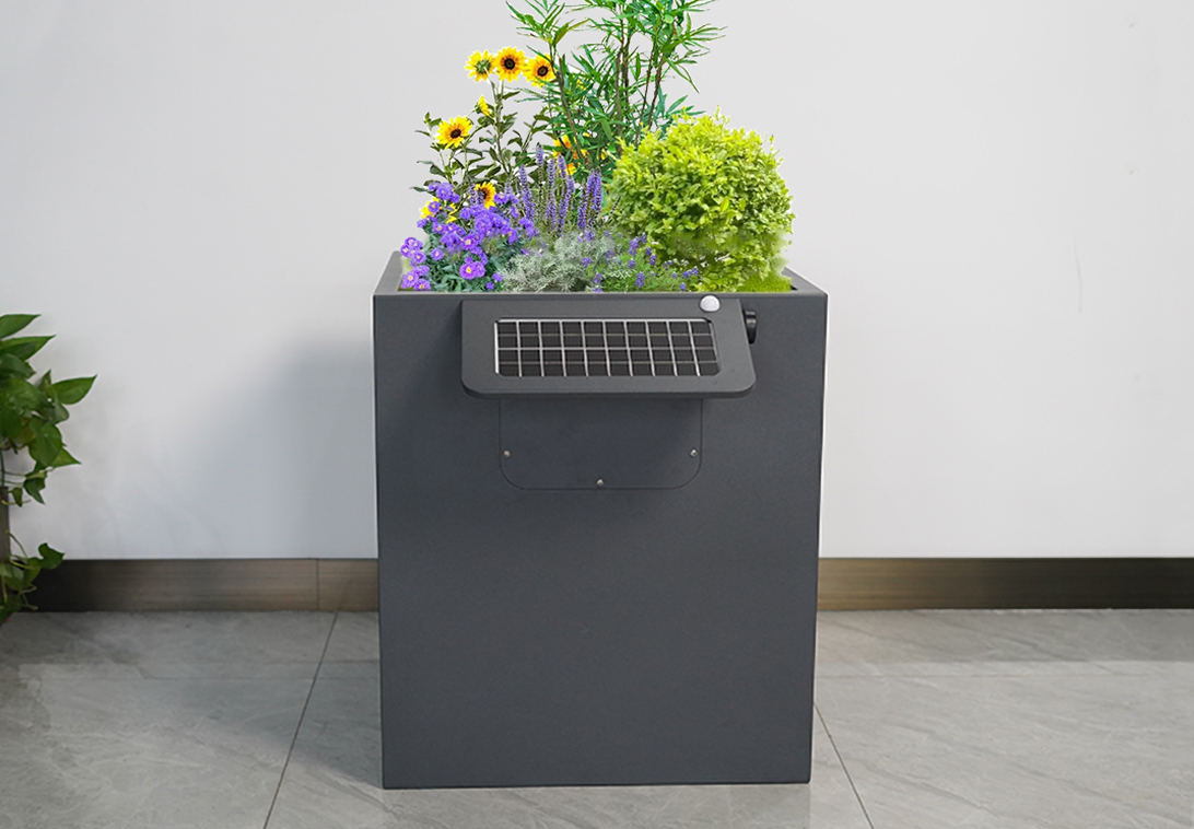 这款智慧养护花箱是方形设计,长,宽,高,大气深邃的咖啡色,箱体采用不锈钢材质,具有出色的耐用性和抗腐蚀性。其节水功能通过精准灌溉系统实现,能根据花卉需求供水,避免水资源浪费。太阳能板通常安装在花箱的侧面能够充分接受阳光照射的位置。它们能够将太阳能转化为电能,并进行储存,维持花箱的整个系统运行。这种光伏储能系统的效率很高,即使在光照强度不同的情况下,也能有效地收集和存储足够的电能。例如,在阳光充足的晴天,晒太阳,可以运行35天以上;而在阴天或光照较弱的情况下,系统依然能够利用所收集到的有限太阳能维持花箱的基本运行,减少了对传统供电的依赖,从而实现节电的目的。
